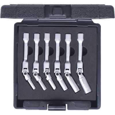 Zest kluczy przegubow do swiec zarowych, dlugich, 6-szt,3/8"•6-kątny•wewnętrzna nakładka czterokątna zgodna z DIN 3120 / ISO1174 z blokadą kulkową•model długi•do bezpiecznego montażu i demontażu świec żarowych•dla trudnodostępnych miejsc•pasuje do wszystkich popularnych świec żarowych•z przykręcanym przegubem kardanowym•włącznie z z pierścieniem gumowym do bezpiecznego trzymaniaświec żarowych•mat satynowany•chrom-wanad•w trwałej walizce z tworzywa sztucznego
