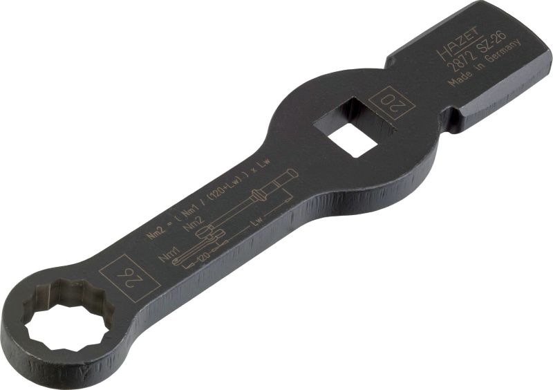 HAZET Klucz udarowy oczkowy ∙ z 2 powierzchniami udarowymi2872SZ-26 ∙ Zabierak kwadratowy drążony 3/4 cala (20 mm) ∙Profil zewnętrzny 12-kątny ∙ Rozmiar klucza 26 mmZastosowanie:Uruchomienie połączenia śrubowego zacisków hamulcóww pojazdach użytkowych•Profil 12-kątny umożliwiający nasadzanie również na trudnodostępne złącza śruboweNp. do DAF XF95 / XF105 / XF•Kontrolowane dokręcenie śrub kluczem dynamometrycznymzgodnie z danymi producenta•Powierzchnia klucza z naniesionym laserowo wzorem doobliczania prawidłowej długości roboczej•Made in Germany•Napęd: Zabierak kwadratowy drążony 3/4 cala (20 mm)•Końcówka: Profil zewnętrzny 12-kątny•Rozmiar klucza: 26 mm•Wymiary: 219 mm•Do obsługi ręcznej