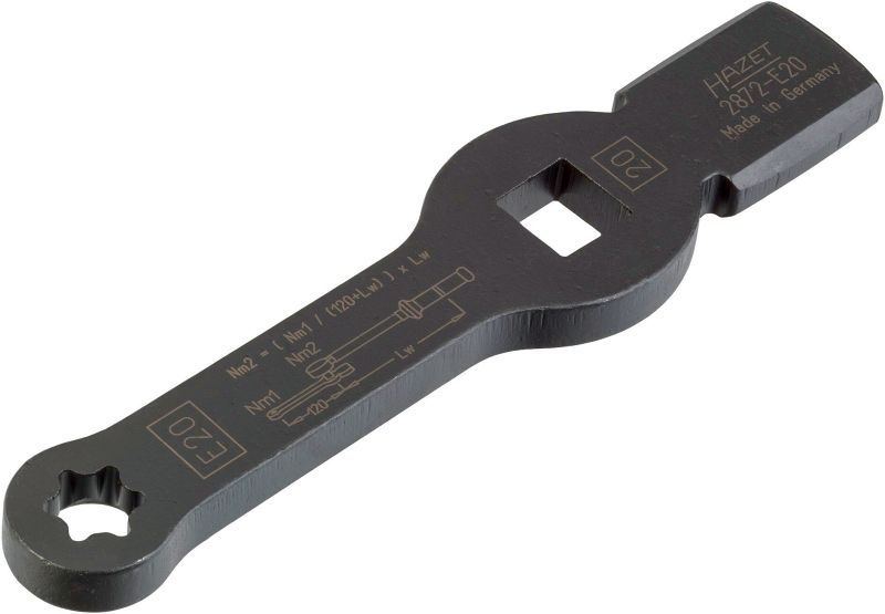 HAZET Klucz udarowy oczkowy ∙ z 2 powierzchniami udarowymi2872-E20 ∙ Zabierak kwadratowy drążony 3/4 cala (20 mm) ∙Profil zewnętrzny TORX® ∙ Rozmiar klucza E20Zastosowanie:Obsługa śrub TORX® na połączeniach śrubowych zaciskóww hamulcach tarczowych na przednich osiach i osiachnadążnych pojazdów użytkowych•Zastosowanie kluczy podczas demontażu i montażu połączeńśrubowych zacisków hamulcowych powoduje, że nie jestkonieczny demontaż dźwigni zwrotniczejNp. do MAN TGL TGM•Kontrolowane dokręcenie połączenia śrubowego kluczemdynamometrycznym zgodnie z danymi producenta•Powierzchnia klucza z naniesionym laserowo wzorem doobliczania prawidłowej długości roboczej•Made in Germany•Napęd: Zabierak kwadratowy drążony 3/4 cala (20 mm)•Końcówka: Profil zewnętrzny TORX®•Rozmiar klucza: ∙ E20•Wymiary: 216 mm•Do obsługi ręcznej
