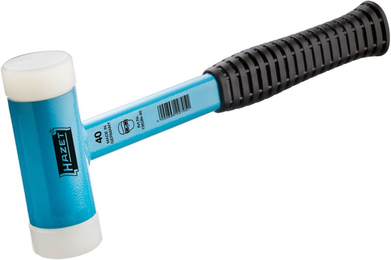 HAZET Młotek z tworzywa sztucznego ∙ bez efektu odrzutu1953N-40 ∙ 40 mm•Bez efektu odrzutu:dzięki metalowemu kulowemu wypełnieniu w elemencie środkowymgłówki młotka i dokładnie dopasowanemu materiałowipowierzchni do pobijania•Wymienne głowice z poliuretanu,nieodpryskujące i niekruszące się•Nie niszczy obrabianego materiału•Wysoka odporność na ścieranie i długa żywotność•Uchwyt z PCW odpornego na olej i benzynę•Made in Germany•Wymiary: 305 mm•Średnica: 40 mm•Masa netto (kg): 0.81 kg