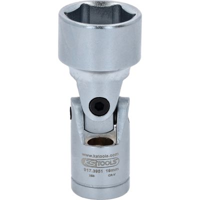 Gniazdo szesciokatne z przegubem 19mm, 3/8"•6-kątny•profil FlankTraction•wewnętrzna nakładka czterokątna zgodna z DIN 3120 / ISO1174 z blokadą kulkową•przegub mocowany przy pomocy śrub•do obsługi ręcznej•mat satynowany•chrom-wanad