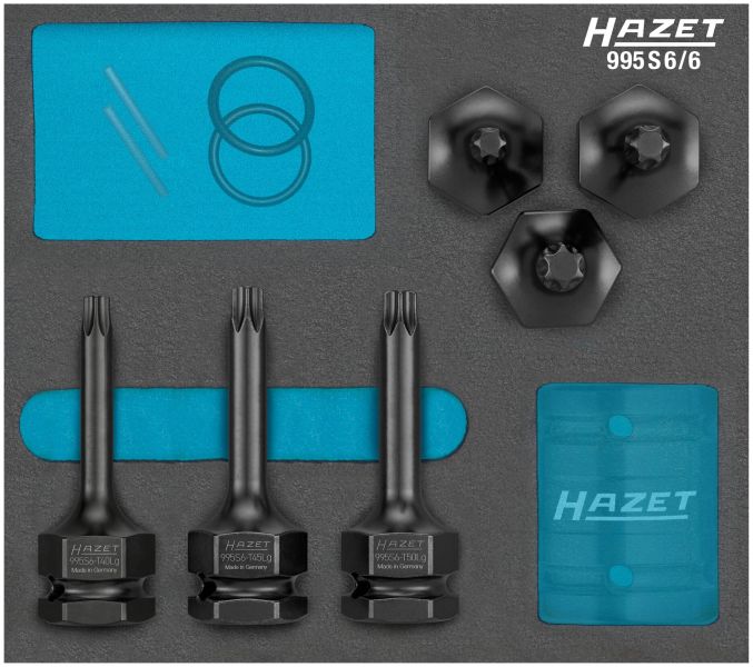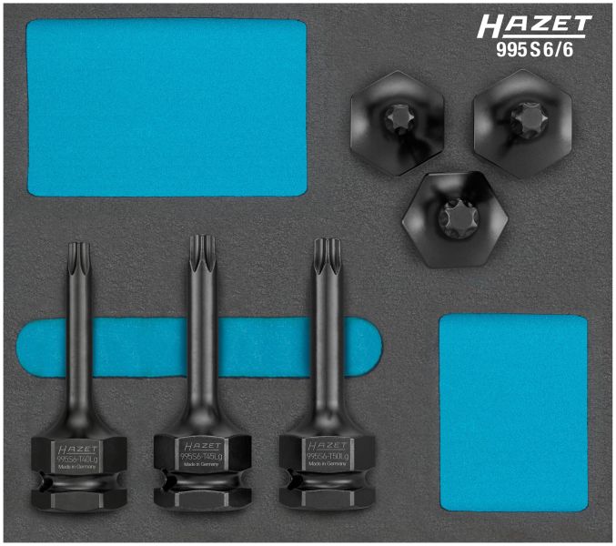 HAZET Zestaw udarowych kluczy nasadowych trzpieniowych995S6/6 ∙ Zabierak kwadratowy drążony 1/2 cala (12,5 mm),Zewnętrzny sześciokąt 24 mm ∙ Profil wewnętrzny TORX® ∙6‑częściowy ∙ T40 ∙ T45 ∙ T50Zastosowanie:Połączenia śrubowe w pojazdach użytkowych i osobowychz profilem wewnętrznym TORX®np. w podwoziu lub układach hamulcowych•Gniazdo kwadratowe Napęd 3/4″ (20 mm) umożliwiaprzenoszenie wysokich momentów przy odkręcaniu•995S6-T50LG Obsługa połączenia śrubowego na zwrotnicy wprzypadku tarcz hamulcowych / łożysk kół w pojazdach FORDTransit rok prod. 2006 →•Opcjonalnie dostępny adapter 1003S-1 do napędu 3⁄4″ (20 mm)•Do wyboru Gniazdo kwadratowe napęd 1⁄2″ (12,5 mm) lubCzop sześciokątny 24 mm•Z otworem do trzpienia ochronnego lub pierścieniasprężynowego zabezpieczającego i rowkiem do o-ringa•Safety-Insert-System, 2-komponentowa wkładka z miękkiejpianki•Powierzchnia: fosforanowana, oliwiona•Made in Germany•Napęd: Zabierak kwadratowy drążony 1/2 cala (12,5 mm),Zewnętrzny sześciokąt 24 mm•Końcówka: Profil wewnętrzny TORX®•Do obsługi maszynowej•Liczba narzędzi: 6
