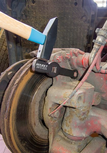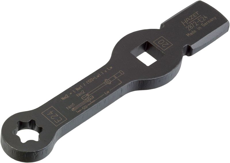 HAZET Klucz udarowy oczkowy ∙ z 2 powierzchniami udarowymi2872-E24 ∙ Zabierak kwadratowy drążony 3/4 cala (20 mm) ∙Profil zewnętrzny TORX® ∙ Rozmiar klucza E24Zastosowanie:Obsługa śrub TORX® na połączeniach śrubowych zaciskóww hamulcach tarczowych na przednich osiach i osiachnadążnych pojazdów użytkowych•Zastosowanie kluczy podczas demontażu i montażu połączeńśrubowych zacisków hamulcowych powoduje, że nie jestkonieczny demontaż dźwigni zwrotniczej•Np. do MAN TGA TGS TGX•MERCEDES-BENZ Atego 970-976 – Pojazdy z amortyzacjąpneumatyczną, połączenie śrubowe zacisku w hamulcutarczowym na tylnej osi•Kontrolowane dokręcenie połączenia śrubowego kluczemdynamometrycznym zgodnie z danymi producenta•Powierzchnia klucza z naniesionym laserowo wzorem doobliczania prawidłowej długości roboczej•Made in Germany•Napęd: Zabierak kwadratowy drążony 3/4 cala (20 mm)•Końcówka: Profil zewnętrzny TORX®•Rozmiar klucza: ∙ E24•Wymiary: 219 mm•Do obsługi ręcznej