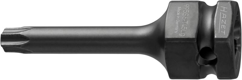 HAZET Udarowy klucz nasadowy trzpieniowy 995S6-T45LG ∙Zabierak kwadratowy drążony 1/2 cala (12,5 mm), Zewnętrznysześciokąt 24 mm ∙ Profil wewnętrzny TORX® ∙ Rozmiar kluczaT45Zastosowanie:Połączenia śrubowe w pojazdach użytkowych i osobowychz profilem wewnętrznym TORX®np. w podwoziu lub układach hamulcowych•Gniazdo kwadratowe Napęd 3/4″ (20 mm) umożliwiaprzenoszenie wysokich momentów przy odkręcaniu•Do wyboru Gniazdo kwadratowe napęd 1⁄2″ (12,5 mm) lubCzop sześciokątny 24 mm•Z otworem do trzpienia ochronnego lub pierścieniasprężynowego zabezpieczającego i rowkiem do o-ringa•Safety-Insert-System, 2-komponentowa wkładka z miękkiejpianki•Powierzchnia: fosforanowana, oliwiona•Made in Germany•Napęd: Zabierak kwadratowy drążony 1/2 cala (12,5 mm),Zewnętrzny sześciokąt 24 mm•Końcówka: Profil wewnętrzny TORX®•Rozmiar klucza: ∙ T45•Wymiary: 75 mm•Długość I1: 43 mm•Do obsługi maszynowej